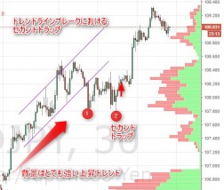 ですから、強い上昇トレンドに途中から乗りたいと思っているなら、プルバックにおける、2回目の失敗でエントリーすると、かなり勝率が上がります。