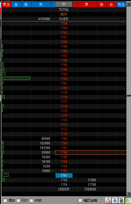 全ての指値注文数量、注文件数の合計が表示されるのも役立ちます。